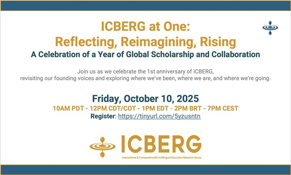 ► ICBERG at ONE: Reflecting, Reimagining, Rising October 10, 2025 - 12PM CDT. Registration: https://tinyurl.com/5yzusntn ![]() At ICBERG at ONE, we'll revisit our founding voices from the ICBERG 2024 Inaugural Event (recording), celebrate milestones like our 2025 special issue in The Bilingual Review, discuss new developments, such this year's EduTalk Series and our forthcoming journal, Forum on International Research in Multilingual Education (FIRME), and open the floor to share visions for ICBERG’s future. It’s informal, inspiring, and all about our community! Event flyer available here. |
